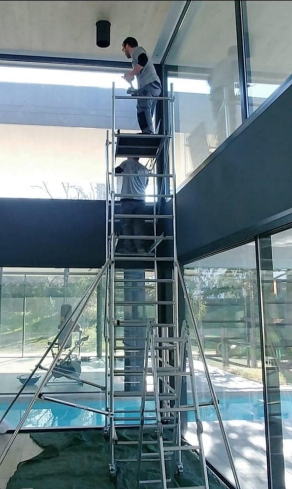 Montaje de andamio de aluminio, protegiendo el suelo y colocándolo en una posición correcta para poder instalar el tubo de salida de humos, que va apretado a placa con tubo ya preinstalado en techo, fijado mecánicamente con caracoles 8 mm de diámetro.