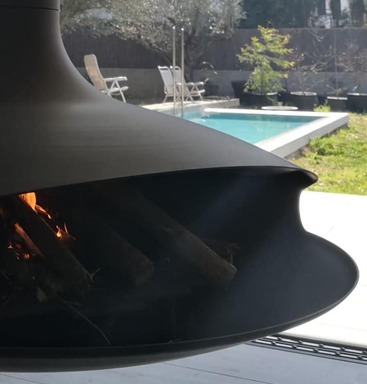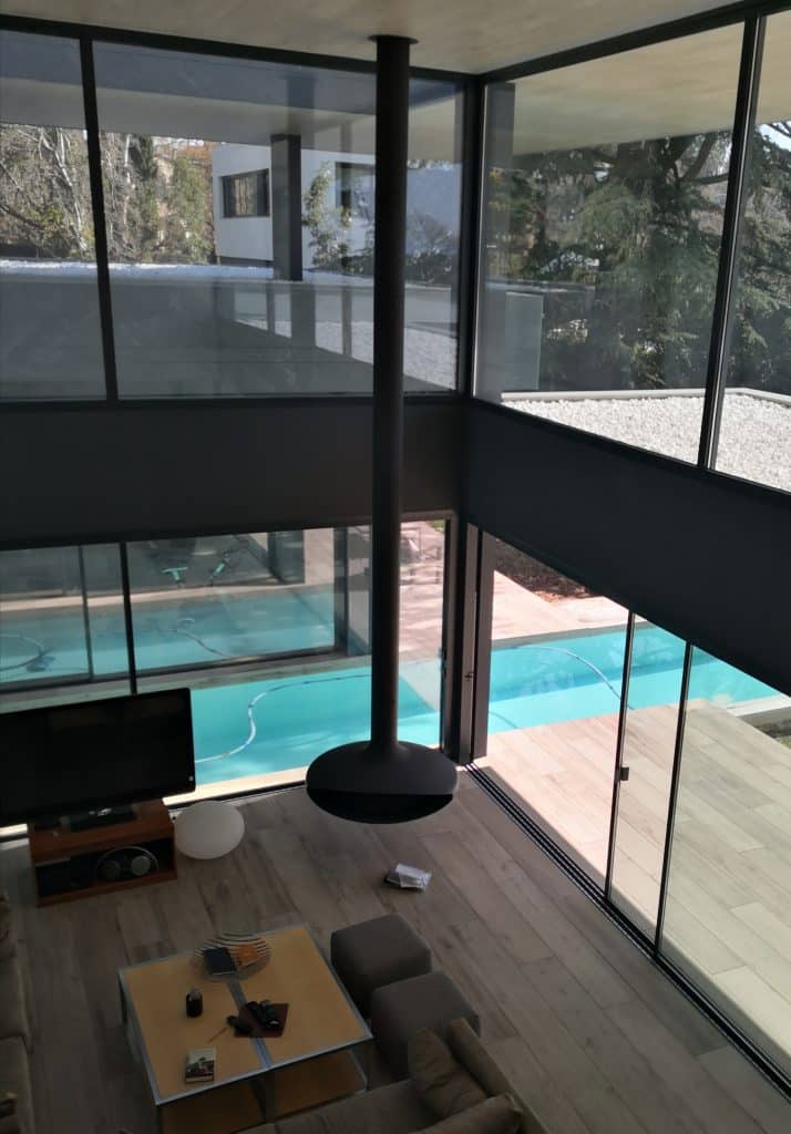 Instalación realizada en una casa particular, con techo de 8,50 metros de altura, una chimenea que con más de 50 años de su nacimiento, sigue siendo un modelo revolucionario, tanto en el diseño de las formas como por sus características técnicas.